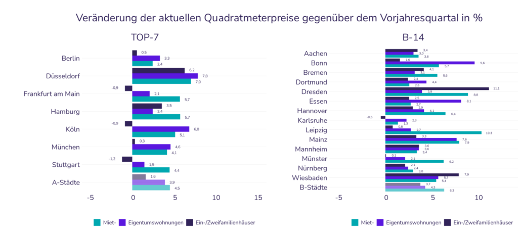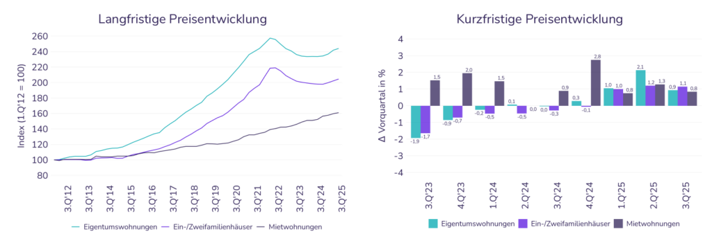 Auf Jahressicht sehen wir am Wohnungsmarkt erstmals wieder positive Vorzeichen. Die Preise für Eigentumswohnungen stiegen im Vergleich zum Vorjahresquartal leicht um 0,1%. Im Vergleich zum Vorquartal stiegen die Preise für Eigentumswohnungen im Bestand um 0,2%.