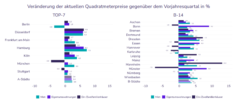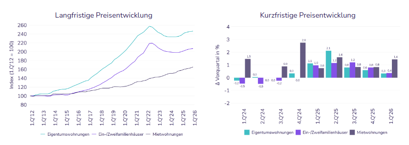 Im Quartalsvergleich zeigt sich jedoch ein deutlich differenzierteres Bild. Die Kaufpreise für Eigentumswohnungen (+0,3 %) und Häuser (+0,4 %) entwickeln sich nur noch verhalten, während die Mieten mit +1,4 % spürbar anziehen.